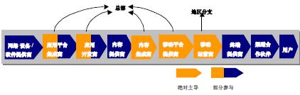 3G時代的移動通信產(chǎn)業(yè)鏈由技術(shù)平臺提供商、設(shè)備提供商、應(yīng)用平臺提供商、應(yīng)用開發(fā)商、內(nèi)容提供商、內(nèi)容集成商、移動平臺提供商、移動運營商、終端提供商、渠道合作伙伴等市場主體構(gòu)成。移動通信產(chǎn)業(yè)鏈?zhǔn)且粋整體功能鏈狀網(wǎng)絡(luò),構(gòu)成產(chǎn)業(yè)鏈的市場主體隨著移動通信技術(shù)、市場競爭情況以及用戶需求的變化而變化。移動運營商在產(chǎn)業(yè)鏈上發(fā)揮的作用也是不同的,每當(dāng)產(chǎn)業(yè)鏈發(fā)生變化時,移動運營商就需要重新進行角色定位。