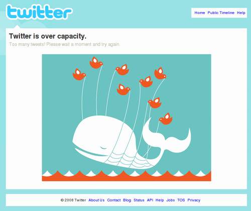 當Twitter宕機或者訪問量超過負荷時,用戶會被導(dǎo)向一個顯示有“失落的鯨魚”的頁面