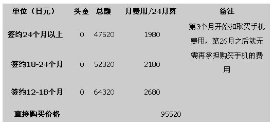 我們都知道日本的購(gòu)買手機(jī)最主要是和運(yùn)營(yíng)商簽約購(gòu)買,我們以夏普2009年夏季最新款手機(jī)Soft Bank 933SH為例,來(lái)說(shuō)明一下在日本購(gòu)買手機(jī)的成本。總的來(lái)說(shuō),就是簽約時(shí)間越長(zhǎng),購(gòu)買手機(jī)價(jià)格越低,簽約時(shí)間越短,購(gòu)買價(jià)格越高。