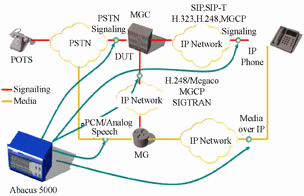例如,運(yùn)營(yíng)商在部署VoIP網(wǎng)絡(luò)時(shí),有可能會(huì)采用A廠家的軟交換和B廠家的接入網(wǎng)關(guān)設(shè)備,如何確認(rèn)這兩家的設(shè)備在一起互通時(shí)沒(méi)有性能上的問(wèn)題?這時(shí)可以采用儀表仿真接入網(wǎng)關(guān)下面的模擬線終端,往網(wǎng)關(guān)和軟交換側(cè)發(fā)起呼叫,再由軟交換將呼叫路由回網(wǎng)關(guān)再到終端。通過(guò)這種方式,由儀表發(fā)起成千上萬(wàn)的呼叫經(jīng)過(guò)接入網(wǎng)關(guān)和軟交換,可以有效地驗(yàn)證這兩種設(shè)備在互通的時(shí)候有沒(méi)有性能和穩(wěn)定性問(wèn)題。