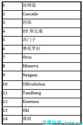 在中國市場上,UT 斯達康和中興公司暫時領先于其他公司。其中,UT 斯達康在海外也有不俗的表現(xiàn),如在印度和日本市場等;華為公司可以借助其整體解決方案的實力,有機會在下一代基于IMS 的IPTV 解決方案中脫穎而出。MRG 曾經(jīng)在2007 年3 月公布過一個市場調(diào)查,對IPTV 中間件及其市場影響力進行了一個排名,具體的結(jié)果見表1。