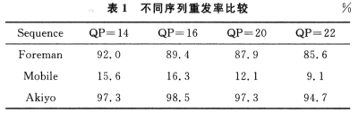 為了更全面評(píng)價(jià)本算法的性能,對(duì)不同測試序列在同樣丟包率情況下對(duì)本章的機(jī)制進(jìn)行性能測試?紤]到影響本章算法性能的包括序列的紋理復(fù)雜程度以及運(yùn)動(dòng)劇烈程度。這里利用運(yùn)動(dòng)較為劇烈但紋理相對(duì)較單一的Foreman序列,紋理復(fù)雜程度較高的Mobile以及運(yùn)動(dòng)程度較低的Akiyo序列作為評(píng)測序列。表1是對(duì)這三個(gè)測試序列在QP=14,16,20,22,丟包率為3%的情況下前100幀做的統(tǒng)計(jì),其中出錯(cuò)Slice個(gè)數(shù)為24,則出錯(cuò)宏塊總數(shù)為24×11=264。令NMB=264,則根據(jù)模式判決結(jié)果,即可得到對(duì)重發(fā)率的統(tǒng)計(jì)。