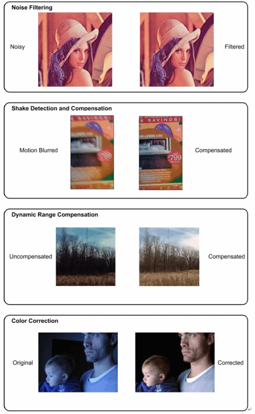 圖: 四種預(yù)處理算法示例:噪聲濾波、抖動檢測與補償、動態(tài)范圍補償和顏色校正。