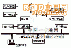 系統(tǒng)采用了兩套獨立的網絡系統(tǒng),第一套是基于485總線半雙工網絡系統(tǒng),第二套是基于以太網的局域網。基于485總線半雙工網絡系統(tǒng)用以連接門口終端、分層器和用戶終端,這主要是從成本上考慮。由于這三部分交換的信息比較少,數(shù)據交換的速度要求也不是很高而且實現(xiàn)比較簡單,故采用了這種網絡系統(tǒng)。