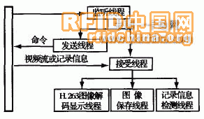 在軟件設計方面包括兩部分,一部分是監(jiān)控終端的監(jiān)控軟件,另一部分是各便件的底層軟件。監(jiān)控終端采用了多線程的軟件設計方法,系統(tǒng)對連接的每一個監(jiān)控點共采用了6個線程,即網絡監(jiān)聽線程、發(fā)送線程、接受線程、H.26 3圖像解碼顯示線程、圖像保存線程和記錄信息(門口終端的撥號、門禁一卡通等記錄信息)檢測線程,如圖4所示。