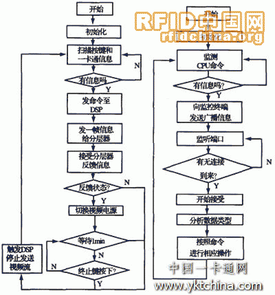 對于底層軟件,主要是門口終端的控制軟件,其工作流程如圖5所示。門口終端上電后,先進行初始化工作,然后開始掃描按鍵和一卡通信息,當確認有變化時,微處理器CPU l先給分層器發(fā)送一幀信息,并且監(jiān)聽分層器的反饋信息,同時啟動DSP通過網絡端口發(fā)送廣播消息給監(jiān)控終端,以便啟動監(jiān)控終端的接受線程接受視頻流和訪問信息或一卡通信息。當時間超過l min或終止鍵按下時,雙方終止通信,門口終端與監(jiān)控終端之間由CPU1觸發(fā)DSP中斷,使其停止發(fā)送視頻流數(shù)據。