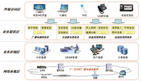 目前用戶是通過電視+機(jī)頂盒的方式享受廣電運(yùn)營商提供的數(shù)字電視服務(wù),而未來用戶可通過計算機(jī)、手機(jī)、VOIP終端、家庭信息機(jī)等多樣化的終端訪問廣電運(yùn)營商所提供的寬帶接入服務(wù)、VOIP的語音服務(wù)、各種信息化應(yīng)用服務(wù)。