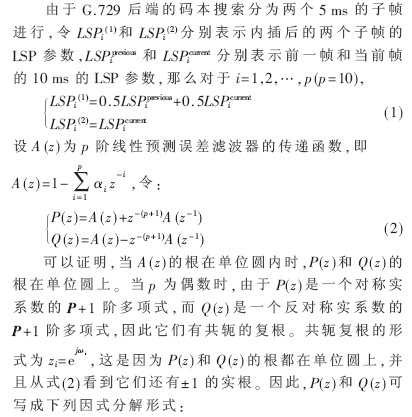 G.729的編碼過(guò)程如下:輸入8 kHz采樣的數(shù)字語(yǔ)音信號(hào)先經(jīng)過(guò)高通濾波預(yù)處理,每10 ms幀作一次線(xiàn)性預(yù)測(cè)分析,計(jì)算10階線(xiàn)性預(yù)測(cè)濾波器系數(shù),然后把這些系數(shù)轉(zhuǎn)換為線(xiàn)譜對(duì)(LSP)參數(shù),采用兩級(jí)矢量量化技術(shù)進(jìn)行量化。自適應(yīng)碼本搜索時(shí),以原始語(yǔ)音與合成語(yǔ)音的誤差知覺(jué)加權(quán)最小為測(cè)度進(jìn)行搜索。固定碼本采用代數(shù)碼本機(jī)構(gòu)。激勵(lì)參數(shù)(自適應(yīng)碼本和固定碼本參數(shù))每個(gè)子幀(5 ms,40個(gè)樣點(diǎn))確定一次。