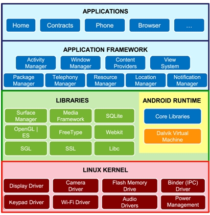 首先我們先來看到Android的基本技術(shù)架構(gòu),Android是以Linux為核心,并采用軟件堆迭(software stack)的架構(gòu)延伸發(fā)展的一套軟件平臺與操作系統(tǒng)。根據(jù)下圖可以看出,其基本架構(gòu)分為五層: