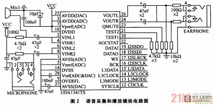 語音采集和播放模塊的作用是將音頻模擬信號(hào)轉(zhuǎn)換為數(shù)字信號(hào),并對(duì)信號(hào)進(jìn)行PCM編碼。其電路如圖2所示。采用Philips公司的UDA1341 TS型立體聲音頻CODEC進(jìn)行音頻編解碼。該芯片提供2個(gè)麥克風(fēng)輸入,可實(shí)現(xiàn)單端輸入、差分輸入等靈活配置,并設(shè)置了可編程增益放大器和自動(dòng)增益控制器,可保證高質(zhì)量的音頻獲取;同時(shí),還集成了聽筒和喇叭輸出的驅(qū)動(dòng)器,喇叭音量可以通過編程調(diào)整。S3C2440A-40微處理器與UDA1341TS編解碼器通過I2S總線直接相連,并采用DMA發(fā)送/接收方式,完成系統(tǒng)的錄音和放音。