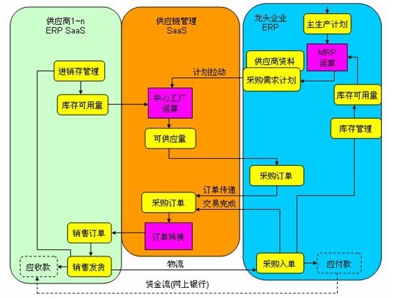 在線需求計(jì)劃管理。當(dāng)龍頭完成企業(yè)內(nèi)部的MRP運(yùn)算后,便輸出“采購需求計(jì)劃”;該計(jì)劃作為供應(yīng)鏈管理平臺,中心工廠(或稱虛擬企業(yè))運(yùn)算的輸入,此刻供應(yīng)鏈管理平臺可以動態(tài)地挖掘供應(yīng)商的(ERP)的“庫存可用量”,并計(jì)算出“可供應(yīng)量”,該數(shù)據(jù)可提供給龍頭企業(yè)編制“采購訂單”。