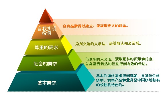 慧聰鄧白氏研究認(rèn)為,客戶(hù)在使用通信產(chǎn)品的時(shí)候也大致可分為四個(gè)需求層次,第一層是基本需求,如基本的通信需求(電話/短信)得到滿(mǎn)足,且價(jià)格適中,有些產(chǎn)品和業(yè)務(wù)是中國(guó)移動(dòng)獨(dú)有的或獨(dú)具特色的;第二層是社會(huì)的需求,(使用中國(guó)移動(dòng))與更多的人交流,獲取更多的資訊和信息,且自身需要傳達(dá)的信息也得到有效的傳達(dá);第三層是尊重的需求,即為所交流的人承認(rèn),能獲知認(rèn)知及榮譽(yù);第四層是自我實(shí)現(xiàn)價(jià)值的需求,即(通過(guò)使用移動(dòng)通信業(yè)務(wù))自身品牌得以建立,能獲取更大的利益。