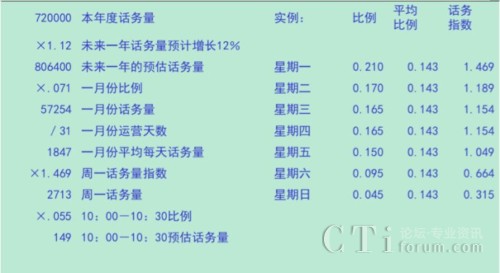 在上圖所示的比例分解過程中,我們假設(shè)去年的總來電量為720000個(gè)。在此基礎(chǔ)上,根據(jù)市場(chǎng)、銷售預(yù)測(cè)以及過去幾年歷史數(shù)據(jù)增長(zhǎng)趨勢(shì)等數(shù)據(jù)測(cè)算出未來一年的話務(wù)量預(yù)計(jì)增長(zhǎng)12%。這樣我們就得到了預(yù)計(jì)未來一年的總來電量為806400個(gè)。根據(jù)歷史數(shù)據(jù)的測(cè)算分析,一月份的來電量通常占全年總來電量的7.1%,因此明年一月份的來電量預(yù)計(jì)為57254個(gè)。由于呼叫中心是7X24小時(shí)運(yùn)營(yíng)的,所以一月份平均每天的來電量為57254/31=1847個(gè)。由于大多數(shù)呼叫中心的來電量規(guī)律是以一周為周期循環(huán)波動(dòng)的,因此我們接下來要測(cè)算四個(gè)(或五個(gè))周一的話務(wù)指數(shù),以覆蓋四個(gè)或五個(gè)周一的來電量情況。我們用周一來電量占全周來電量的相對(duì)比例除以其七分之一的絕對(duì)比例,得出周一的來電量指數(shù)為1.469,也就是說,周一的來電量是相對(duì)較多的,相當(dāng)于一周日平均來電量的約147%。由此我們得出周一話務(wù)量為2713個(gè)。然后我們?cè)俑鶕?jù)由歷史數(shù)據(jù)測(cè)算出的周一一天中48個(gè)半小時(shí)時(shí)段占全天來電量的比例測(cè)算出周一上午10:00-10:30的來電量為149個(gè)。剩下的周二至周日都可以采用同樣的方法來推算預(yù)測(cè)。