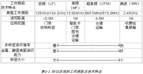 RFID系統(tǒng)的工作頻段可以為低頻(LF)(30-300kHz,典型頻率有125 kHz,134.2 kHz)、高頻(HF)(3-30MHz,典型頻率為13.56M Hz)、超高頻(UHF)(300-968MHz,典型頻率869.6MHz、915.3MHz)、微波(MW)(2.45-5.8GHz,典型頻率為2.45GHz)等四個頻段,具體的頻點由各個國家或地區(qū)的無線電管理部門確定。根據(jù)不同的工作頻段,在無源的情況下,其技術(shù)特點和應用范圍也不同,如下表所示: