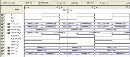 使用的信號(hào)包括:數(shù)據(jù)信號(hào)data_a,dat_b;讀寫有效信號(hào)wren_a,wren_b;地址信號(hào)address_a,address_b;時(shí)鐘信號(hào)clock_a,clock_b;輸出數(shù)據(jù)信號(hào)q_a,q_b?梢钥吹剿械男盘(hào)都是成對(duì)出現(xiàn)的,就是為了進(jìn)行乒乓方式的數(shù)據(jù)傳輸。分成了兩個(gè)RAM區(qū)域,A和B,相當(dāng)于前面講乒乓方式里的數(shù)據(jù)緩沖模塊1和2。兩個(gè)RAM塊是交替著讀寫(由I_a和I_b決定),輸出數(shù)據(jù)流也是由I決定。剛說到寫時(shí)鐘是13.5M,讀時(shí)鐘是27M,所以clock_a和clock_b必須是讀寫時(shí)鐘切換著輸入,而且地址的計(jì)數(shù)也不一樣,寫周期時(shí)候地址增加的時(shí)鐘是13.5M,讀周期地址增加的時(shí)鐘是27M。所以每行的數(shù)據(jù)讀了兩遍,相當(dāng)于隔行變逐行。圖6在Qartus II下RAM的乒乓操作功能仿真圖: