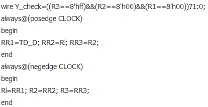 在硬件描述語言中,完成上述過程還是比較簡(jiǎn)單的。例如檢測(cè)電路,只要描述一個(gè)移位寄存器就可以了,具體代碼如下: