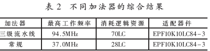 (2)針對(duì)不同運(yùn)算的位寬需要,設(shè)計(jì)專用的加法器和乘法器。本文對(duì)整數(shù)變換中的加法器采用三級(jí)流水線加法器,實(shí)現(xiàn)9位加法,每級(jí)流水線完成三位超前進(jìn)位加法,將邏輯延遲限制在三位加法器之內(nèi)。圖2給出了9位加法器的流水線實(shí)現(xiàn)框圖。選用EPF10K10LC84-3作為適配器件,經(jīng)過(guò)Synplify Pro 7.3綜合,結(jié)果表明這種加法器具有較優(yōu)的最高工作頻率和硬件開銷。如表2所示, 常規(guī)加法器的最高工作頻率為37.0MHz,消耗資源卻為28LC,而經(jīng)過(guò)優(yōu)化的三級(jí)流水線加法器在消耗資源增加不多的情況下,其最高工作頻率相比常規(guī)加法器提高了257%,達(dá)到94.5MHz。