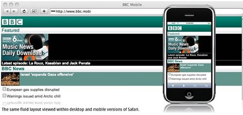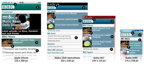 BBC還可以為特定的設(shè)備(或是一組設(shè)備)重新編排一些內(nèi)容。iPhone有非常豐富的功能,因此iPhone版的BBC還有音樂下載選項(xiàng),而其他的設(shè)備可能只會(huì)顯示今天最熱門的‘BBC新聞’。可以根據(jù)數(shù)據(jù)的大小,多媒體的處理能力甚至是屏幕的尺寸決定是否需要針對(duì)iPhone提供更加豐富的內(nèi)容。以Nokia 6680上的‘特色’顯示為例,它大部分的顯示內(nèi)容是讓用戶滾動(dòng)屏幕查看今天最熱門新聞故事。iPhone上顯示了三個(gè)新聞故事,而其中只有一篇配有插入。這使得用戶無需滾動(dòng)屏幕就可以大致了解全部的咨詢。
