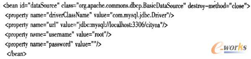 與本地開發(fā)不同的是云計算平臺下,由于服務器采用虛擬主機技術,無法像本地服務器那樣配置數據庫連接池,因此需要CRM系統(tǒng)自己管理數據庫連接池。本系統(tǒng)使用Spring管理下的數據庫連接池,運用Apache開源DBCP框架配置連接池代碼如下: