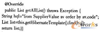 為簡化業(yè)務層代碼,使用Spring整合Hibernate的HibernateTemplate封裝Session和HQL的執(zhí)行。業(yè)務層的簡化示意代碼如下:
