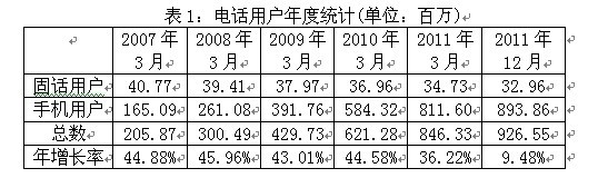 政府對電信市場的開放不僅帶來了電信產(chǎn)業(yè)的快速發(fā)展,激烈的競爭也令消費者享受到性價比更高的服務。近幾年,電話用戶總數(shù)持續(xù)增長,從1999年的2281萬增加到2011年3月底的8億4633萬。截至2011年12月31日,電話用戶總數(shù)達到9億2655萬,說明從2011年4-12月期間新增用戶8022萬。其中,手機用戶數(shù)增長最為顯著,從2007年的1億6509萬增加到2011年3月的8億1160萬,2011年12月底達到8億9386萬。但是,固話用戶的數(shù)量則從2007年的4077萬減少到2011年3月的3473萬,到2011年12月僅有3269萬。(見表1)
