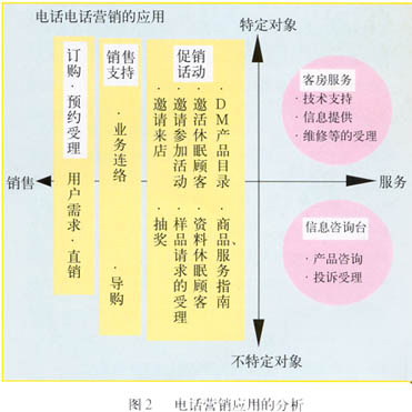 ——圖2表示以電話營銷的目的及對象為軸分析電話營銷的應(yīng)用。縱軸為對象,分為“特定”和“不特定”,橫軸為目的,分為“服務(wù)”和“銷售”。這樣右上區(qū)域=“特定對象X服務(wù)”,即為客戶服務(wù),右下區(qū)域=“不特定對象X服務(wù)”,對應(yīng)信息咨詢;左側(cè)為銷售。從對象來看,服務(wù)更偏重于“特定對象”。從目的來看,訂購/預(yù)約受理是最直接的銷售行為,所以放在最左,銷售支持在中間,促銷活動靠右。