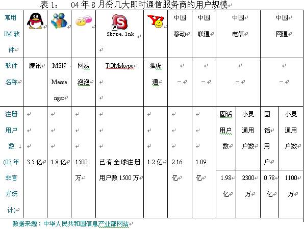 11月16日,TOM在線和歐洲行業(yè)巨頭Skype在京聯(lián)手推出聊天工具TOM-Skype,此業(yè)務(wù)的出現(xiàn),立即在即時(shí)通信市場上掀起了軒然大波。其清晰的話音質(zhì)量,簡潔方便的操作界面,擁有來自165個(gè)國家1500多萬的全球用戶,在極短的時(shí)間內(nèi)就吸引到了大量的中國用戶,更讓基礎(chǔ)運(yùn)營商感到不安的是skype強(qiáng)大的語音聊天功能將可能大大改變傳統(tǒng)電信的使用習(xí)慣;而與此同時(shí),現(xiàn)有的QQ,POPO等國內(nèi)即時(shí)通信工具也早已開展了語音聊天功能,只是苦于目前話音質(zhì)量不盡理想而已。面對眾多虛擬運(yùn)營商現(xiàn)實(shí)和潛在威脅,幾大基礎(chǔ)運(yùn)營商選擇先下手為強(qiáng),進(jìn)入“即時(shí)通信”市場的戰(zhàn)略也就不足為怪了。