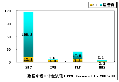 計世資訊(CCW Research)數(shù)據(jù)顯示,2006年第二季度,移動增值業(yè)務市場規(guī)模達到182億元人民幣,移動增值業(yè)務指依托移動通信網絡所提供的基本服務而開展的增值數(shù)據(jù)業(yè)務服務,市場規(guī)模包括移動運營商和服務提供商(SP)收入。其中SMS、IVR、CRBT、WAP和MMS市場規(guī)模分別為118.3、6.5、15.7、24.8和4.4億元人民幣,其他移動增值業(yè)務市場規(guī)模12.3億元人民幣,包括JAVA、BREW、移動定位等業(yè)務。