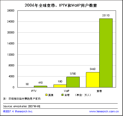 iResearch艾瑞市場咨詢根據eMarketer最新的數據發(fā)現(xiàn),寬帶上網環(huán)境為一些列的寬帶平臺應用產品創(chuàng)造了良好的使用環(huán)境,各種服務同步發(fā)展起來。隨著全球寬帶用戶數量的逐漸增加,全球IPTV和VoIP用戶也迅速成長。到2006年全球寬帶用戶達到2.511億人,VoIP和IPTV的全球用戶數量也分別達到了3780萬人和490萬人。
