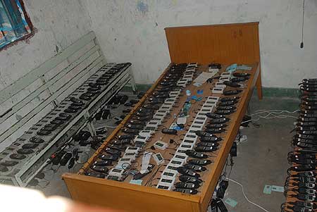 22日,辦案民警喬裝普通市民在民房里搜尋,透過(guò)窗戶終于發(fā)現(xiàn)一間房間里平整地?cái)[放著一兩百部手機(jī)。不一會(huì)兒,他們等來(lái)了房東雷某,將房門打開,眼前的一幕讓民警們大吃一驚,只見房間里的木床和椅子上一排排整齊地?cái)[放著近兩百部手機(jī),每部手機(jī)連接一個(gè)白色的盒子,指示燈在不停地閃爍著。