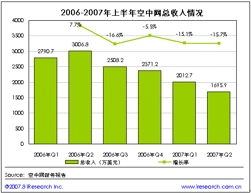空中網(wǎng)2007年第二季度財(cái)報(bào)數(shù)據(jù)顯示,第二季度空中網(wǎng)的總收入1695.9萬美元,同比負(fù)增長(zhǎng)43.6%,環(huán)比負(fù)增長(zhǎng)15.7%。與第一季度相比在空中網(wǎng)兩個(gè)產(chǎn)品平臺(tái)的主要2G業(yè)務(wù)和2.5G的業(yè)務(wù)收入都出現(xiàn)了不同程度的下降,但2G業(yè)務(wù)中的IVR業(yè)務(wù)收入則出現(xiàn)了大幅上升。