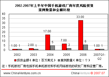 ChinaVenture分析師指出,除2006年觸通安騰和掌上明珠依靠手機(jī)網(wǎng)游業(yè)務(wù)獲得數(shù)百萬美元投資外,其余企業(yè)獲融資原因均為投資商看好手機(jī)單機(jī)游戲業(yè)務(wù)。2007年之前由于手機(jī)網(wǎng)游市場(chǎng)規(guī)模過小,加上無線網(wǎng)絡(luò)環(huán)境制約,風(fēng)險(xiǎn)投資商大多抱以觀望態(tài)度。
