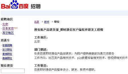 百度有意推IM產(chǎn)品的傳聞由來已久,不過該傳聞一直未得到官方證實。但在其官網(wǎng)最新公布的招聘頁面中,百度已向外界羅列出即時通信客戶端軟件研發(fā)工程師(搜索新產(chǎn)品研發(fā)部)、即時通信軟件產(chǎn)品經(jīng)理(客戶端軟件業(yè)務(wù)部)等職位,上述工作地點均在北京,可見百度的IM戰(zhàn)略布局已具雛形。