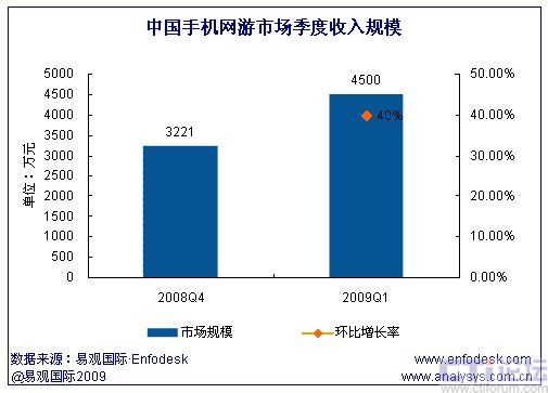 2009年第1季度中國手機(jī)網(wǎng)游市場規(guī)模為4500萬元 用戶規(guī)模達(dá)330萬人