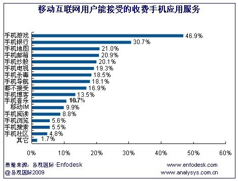 CTI論壇(ctiforum)06月22日消息:據(jù)易觀國(guó)際(Analysys International)《中國(guó)手機(jī)應(yīng)用市場(chǎng)用戶(hù)調(diào)研報(bào)告2009》研究發(fā)現(xiàn),移動(dòng)互聯(lián)網(wǎng)用戶(hù)可接受收費(fèi)的應(yīng)用主要是手機(jī)游戲和手機(jī)銀行/支付,其比例分別為47%和31%,而手機(jī)游戲也是移動(dòng)互聯(lián)網(wǎng)用戶(hù)使用比例較高的手機(jī)應(yīng)用服務(wù)之一。另外,用戶(hù)可接受程度較高的還包括手機(jī)郵箱、手機(jī)導(dǎo)航、手機(jī)炒股、手機(jī)電視/視頻以及手機(jī)殺毒等應(yīng)用。而移動(dòng)互聯(lián)網(wǎng)用戶(hù)對(duì)于手機(jī)社區(qū)和手機(jī)搜索收費(fèi)的接受度較低。研究發(fā)現(xiàn),移動(dòng)互聯(lián)網(wǎng)用戶(hù)可接受收費(fèi)的應(yīng)用主要是手機(jī)游戲和手機(jī)銀行/支付,其比例分別為47%和31%,而手機(jī)游戲也是移動(dòng)互聯(lián)網(wǎng)用戶(hù)使用比例較高的手機(jī)應(yīng)用服務(wù)之一。另外,用戶(hù)可接受程度較高的還包括手機(jī)郵箱、手機(jī)導(dǎo)航、手機(jī)炒股、手機(jī)電視/視頻以及手機(jī)殺毒等應(yīng)用。而移動(dòng)互聯(lián)網(wǎng)用戶(hù)對(duì)于手機(jī)社區(qū)和手機(jī)搜索收費(fèi)的接受度較低。
