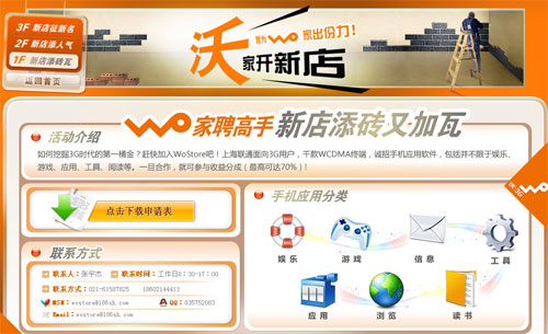 上海聯(lián)通在該網(wǎng)站特別設定“我家開新店”版塊,為新店征名,同時尋求軟件開發(fā)伙伴,并稱包括不限于娛樂、游戲、應用、工具、閱讀等類別,一旦合作就可參與收益分成,最高可達70%。