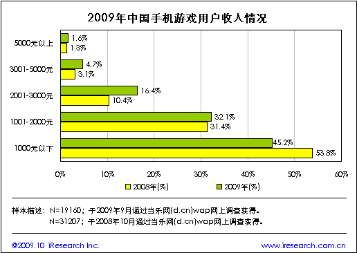 當(dāng)樂網(wǎng)調(diào)研數(shù)據(jù)顯示,2009年手機(jī)游戲用戶的月收入在1000~3000元之間的占比為48.5%,較2008年增長(zhǎng)6.7個(gè)百分點(diǎn)。收入高于2000元的中高收入用戶群體占22.7%,比2008年占比上升7.9個(gè)百分點(diǎn),收入在1000元以下的低收入群體占45.2%,比2008年占比減少8.6個(gè)百分點(diǎn)。與2008年對(duì)比,2009年手機(jī)游戲用戶的收入水平有明顯提高,用戶的消費(fèi)潛力有所增強(qiáng)。