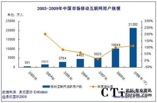 2009年移動(dòng)互聯(lián)網(wǎng)用戶將超2億,與2008年的1.005億用戶數(shù)相比,年增長(zhǎng)率達(dá)111.78%。用戶數(shù)量增長(zhǎng)的同事,移動(dòng)互聯(lián)網(wǎng)用戶主動(dòng)需求也日趨旺盛,尤其表現(xiàn)在手機(jī)網(wǎng)游、手機(jī)閱讀、手機(jī)證券、移動(dòng)微博等細(xì)分領(lǐng)域方面,用戶多樣化需求也間接引導(dǎo)移動(dòng)互聯(lián)網(wǎng)應(yīng)用服務(wù)的快速發(fā)展。