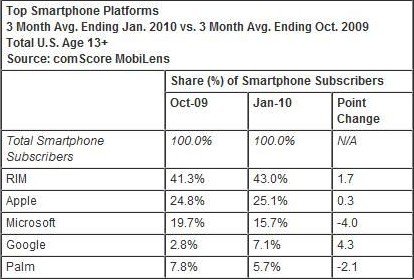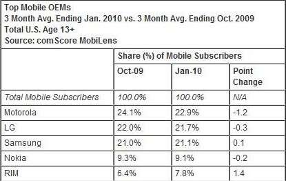 3月11日消息,據(jù)國外媒體報道,全球IT信息服務提供商comScore公司最近發(fā)布了一項2009年第四季度(2009年10月至2010年1月)美國手機市場調查報告。這份報告對手機原配件生產商(OEMs)及智能手機操作系統(tǒng)平臺做了相關的行業(yè)排名,排名依據(jù)為美國市場13歲以上手機用戶群數(shù)據(jù)的統(tǒng)計,以及用戶手機使用行為的調查數(shù)據(jù)。一月份報告顯示摩托羅拉以22.9%的市場份額占據(jù)了第一位。RIM公司則占據(jù)著智能手機市場43%的市場份額,競爭優(yōu)勢明顯。