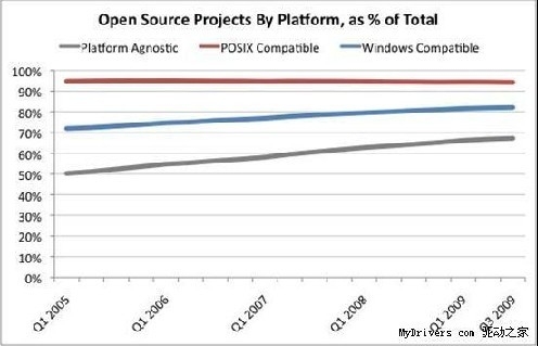 而在四年半之前的2005年第一季度,還只有72%的開(kāi)源軟件與Windows系統(tǒng)兼容。另外,POSIX(可移植操作系統(tǒng)接口)兼容的開(kāi)源軟件比