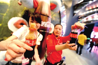 昨天世博園里溫度很高,記者逛得口干舌燥,抬頭看到一個高達(dá)15米的巨型LED可口可樂瓶,這是“快樂工坊”的招牌。