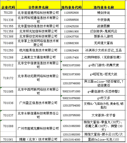 依據(jù)省移動公司上報調查發(fā)現(xiàn),下列合作伙伴存在違約行為,依據(jù)《中國移動游戲業(yè)務合作伙伴信用積分管理辦法V2.0》,處理如下: