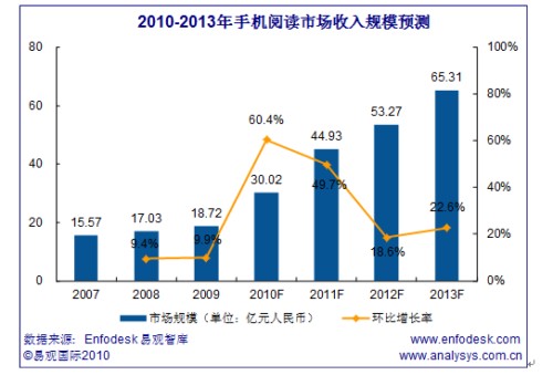 易觀國際(Analysys International)分析預(yù)計2010年手機閱讀市場規(guī)模將突破30億元。
