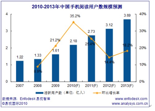 中國手機閱讀市場2010年在運營商閱讀基地的推動下,收入規(guī)模相比2009年有快速的增長,增長幅度達(dá)60.4%。預(yù)計2013年中國手機閱讀市場銷售規(guī)模將達(dá)到65.31億元,活躍用戶達(dá)到3.69億人。