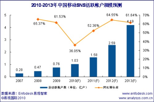 根據(jù)Enfodesk易觀智庫產(chǎn)業(yè)數(shù)據(jù)庫最新發(fā)布的數(shù)據(jù)顯示,到2013年中國移動SNS活躍帳戶規(guī)模將達(dá)到4.19億,如下圖所示: