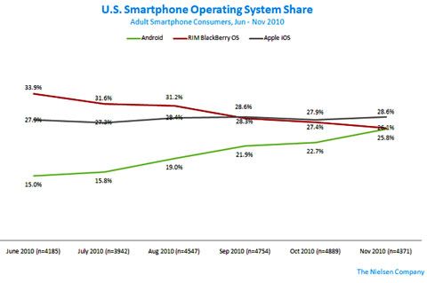 北京時間1月4日早間消息,市場研究公司尼爾森周一發(fā)布的報(bào)告顯示,在美國智能手機(jī)市場,蘋果的iOS的份額仍然排名首位,市場占有率為28.6%。