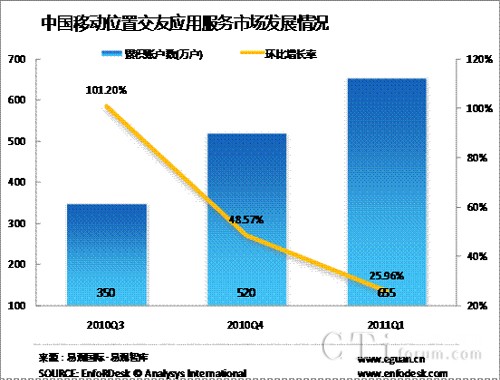 2011年Q1中國移動位置交友應(yīng)用累計帳戶數(shù)達655萬