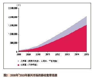由于新興市場(chǎng)的固網(wǎng)寬帶資源相對(duì)短缺,因此這些地方移動(dòng)寬帶替代固定寬帶的可能性將非常大。同時(shí),由于大屏幕移動(dòng)寬帶終端(便攜式電腦、上網(wǎng)本、平板電腦)一般比小屏幕終端的價(jià)格要高,因此我們認(rèn)為小屏幕終端將主導(dǎo)新興市場(chǎng),到2015年77%的移動(dòng)寬帶連接將基于小屏幕終端進(jìn)行(見(jiàn)圖2)。