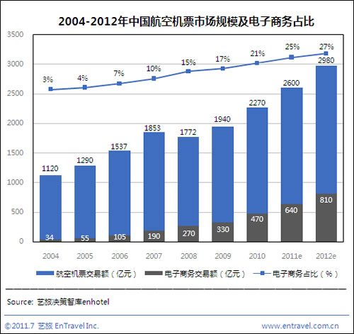2011年上半年中國(guó)機(jī)票電子商務(wù)交易額達(dá)310億元,同期民航機(jī)票交易額為1250億元,電子商務(wù)占比升至25%,距美國(guó)45%的滲透率仍有差距。預(yù)計(jì)2011全年中國(guó)航空機(jī)票電子商務(wù)交易額將達(dá)640億元,而民航機(jī)票交易額將達(dá)2600億元。