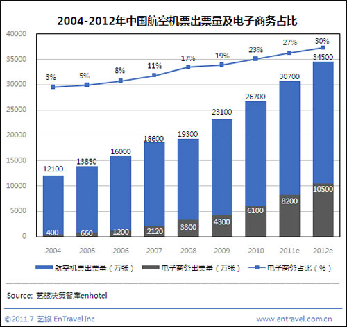 出票量方面,2011年上半年中國(guó)航空市場(chǎng)通過(guò)電子商務(wù)渠道的出票量約3900萬(wàn)張,航空市場(chǎng)出票量為1.4億張,電子商務(wù)渠道占整體出票量的28%。隨著第三季度航空市場(chǎng)進(jìn)入旺季,需求將帶動(dòng)出票量強(qiáng)勢(shì)上升。藝旅咨詢預(yù)測(cè)2011年中國(guó)航空機(jī)票電子商務(wù)出票量將達(dá)8200萬(wàn)張。